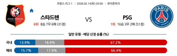 [리그앙] 2월14일 토토분석 스타드 렌 FC vs 파리 생제르맹 스포츠분석