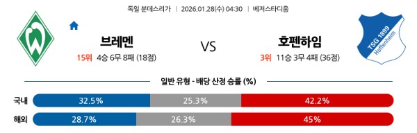 [분데스] 1월28일 토토분석 베르더 브레멘 vs 호펜하임 스포츠분석