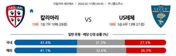 [세리에A] 2월17일 토토분석 칼리아리 칼초 vs US 레체 스포츠분석