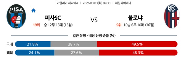 [세리에A] 3월03일 토토분석 피사SC vs 볼로냐 스포츠분석
