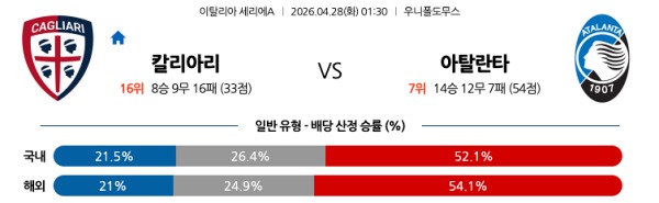 [세리에A] 4월28일 토토분석 칼리아리 칼초 vs 아탈란타 스포츠분석