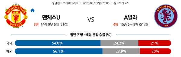 [EPL] 3월15일 토토분석 맨체스터 유나이티드 vs 애스턴 빌라 스포츠분석