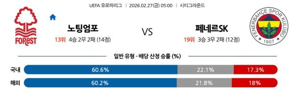 [UEFA] 2월27일 토토분석 노팅엄 포레스트 vs 페네르바체 스포츠분석