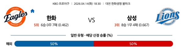 [KBO] 4월14일 토토분석 한화 vs 삼성 스포츠분석