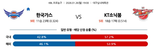[KBL] 1월26일 토토분석 대구 한국가스공사 vs 수원 KT 스포츠분석