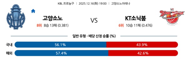12월16일 고양 소노 vs 수원 KT 토토분석