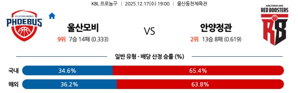 12월17일 울산 현대모비스 vs 안양 정관장 토토분석