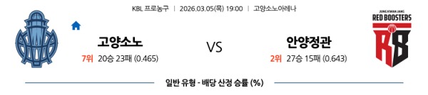 [KBL] 3월05일 토토분석 고양 소노 vs 안양 정관장 스포츠분석