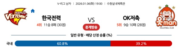 [남자V리그] 1월6일 토토분석 한국전력 vs OK 저축은행 스포츠분석