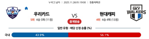 [남자V리그] 11월26일 토토분석 우리카드 vs 현대캐피탈 스포츠분석