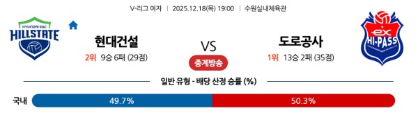 12월18일 현대건설 vs 한국 도로공사 토토분석